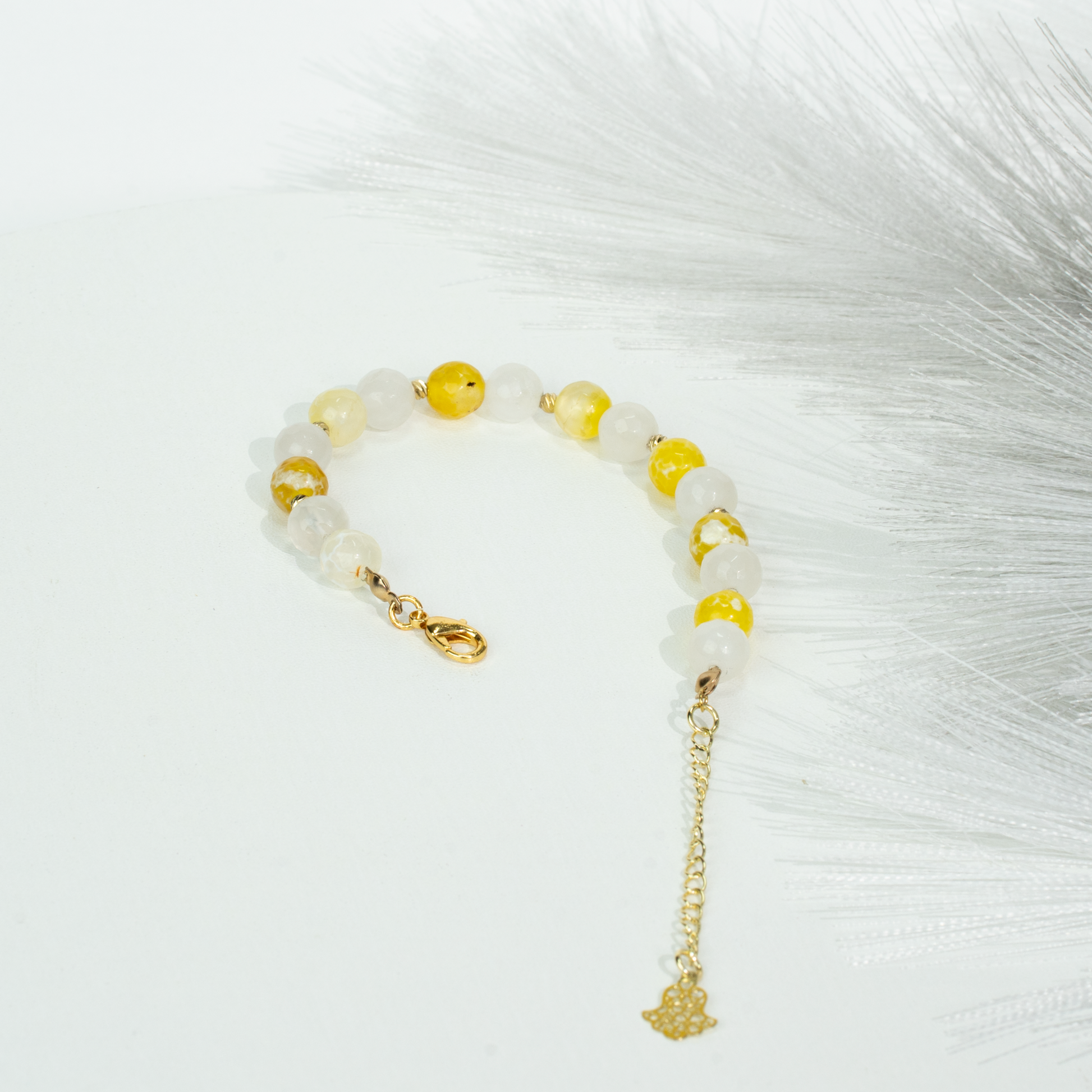 Le Bracelet Douce harmonie allie élégance et équilibre énergétique. Conçu pour harmoniser les vibrations personnelles, il favorise la sérénité et la concentration au quotidien. Sa teinte jaune éclatante stimule la créativité et la joie, tandis que sa finition soignée garantit un porté confortable et durable. Un accessoire parfait pour ceux qui recherchent à la fois style et bien-être.